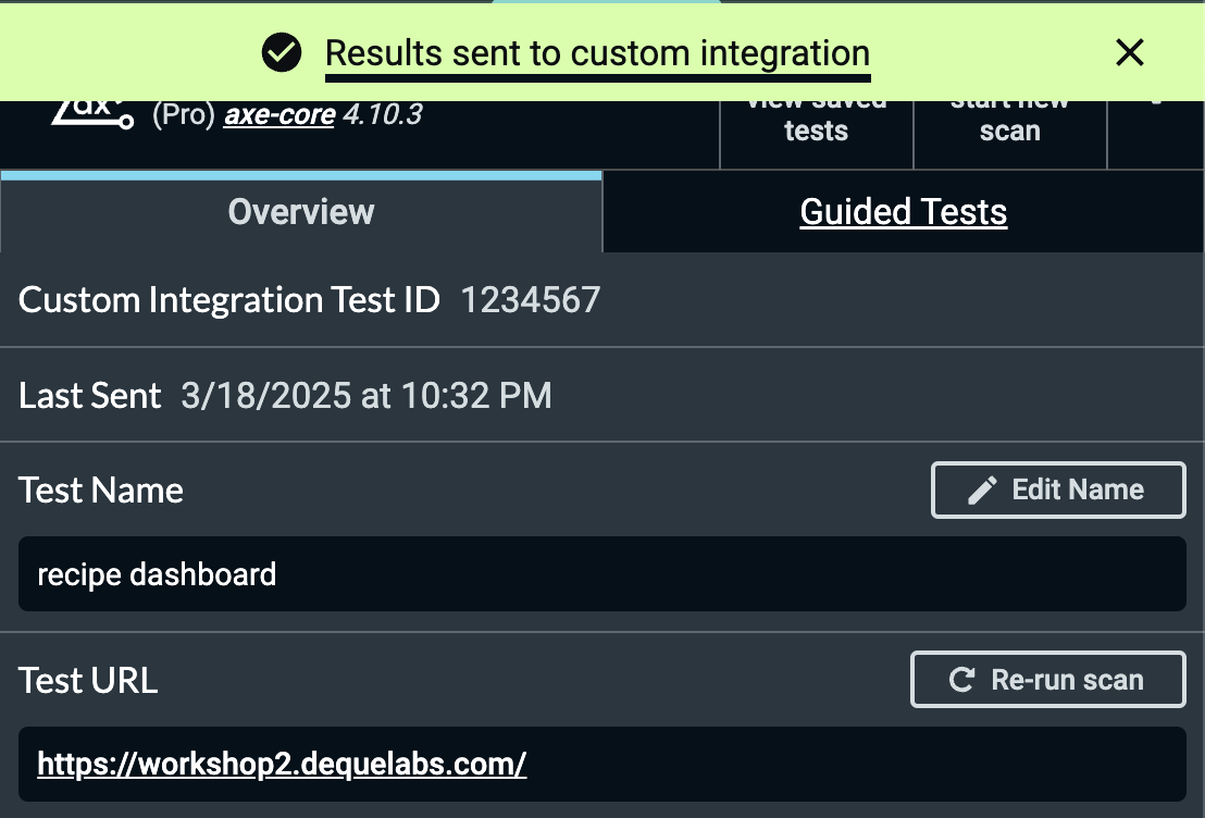 testId: the identifier of the test within your internal application (e.g.1234567)url: the URI encoded test URL (e.g.https%3A%2F%2Fworkshop.dequelabs.com)