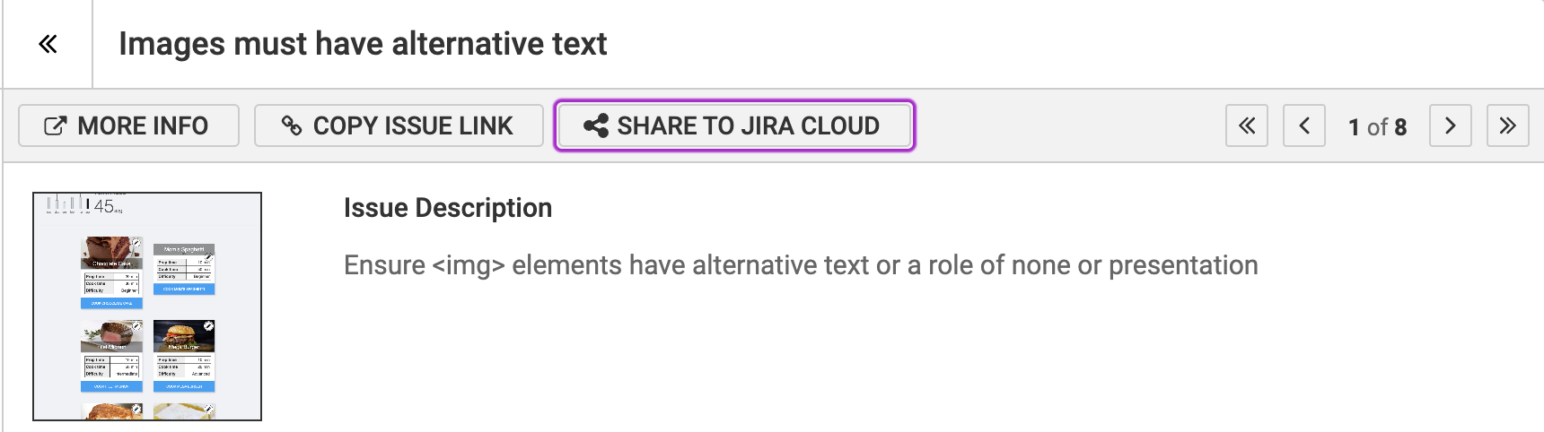 Sending issues to Jira can be done from an axe DevTools Extension issues report. On this report you can activate either the "SHARE TO JIRA" button, which will send the currently viewed issue to Jira, or the "SHARE ALL TO JIRA" button, which will send the entire group of issues into 1 single Jira ticket.