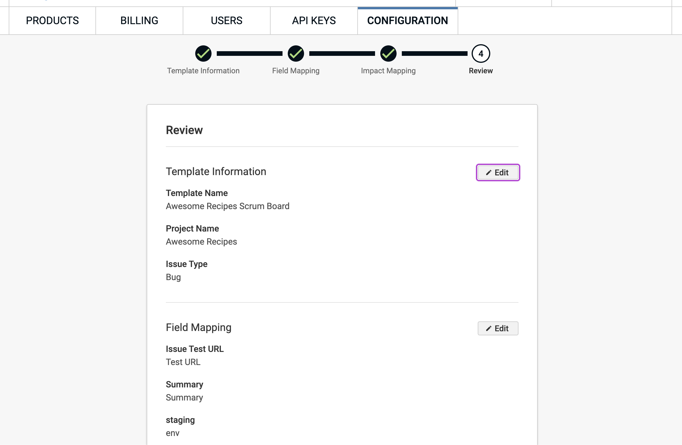 - Fill out the fields on the "Template Information", "Field Mapping", and "Impact Mapping" steps. You can view more details for each step in the following sections.