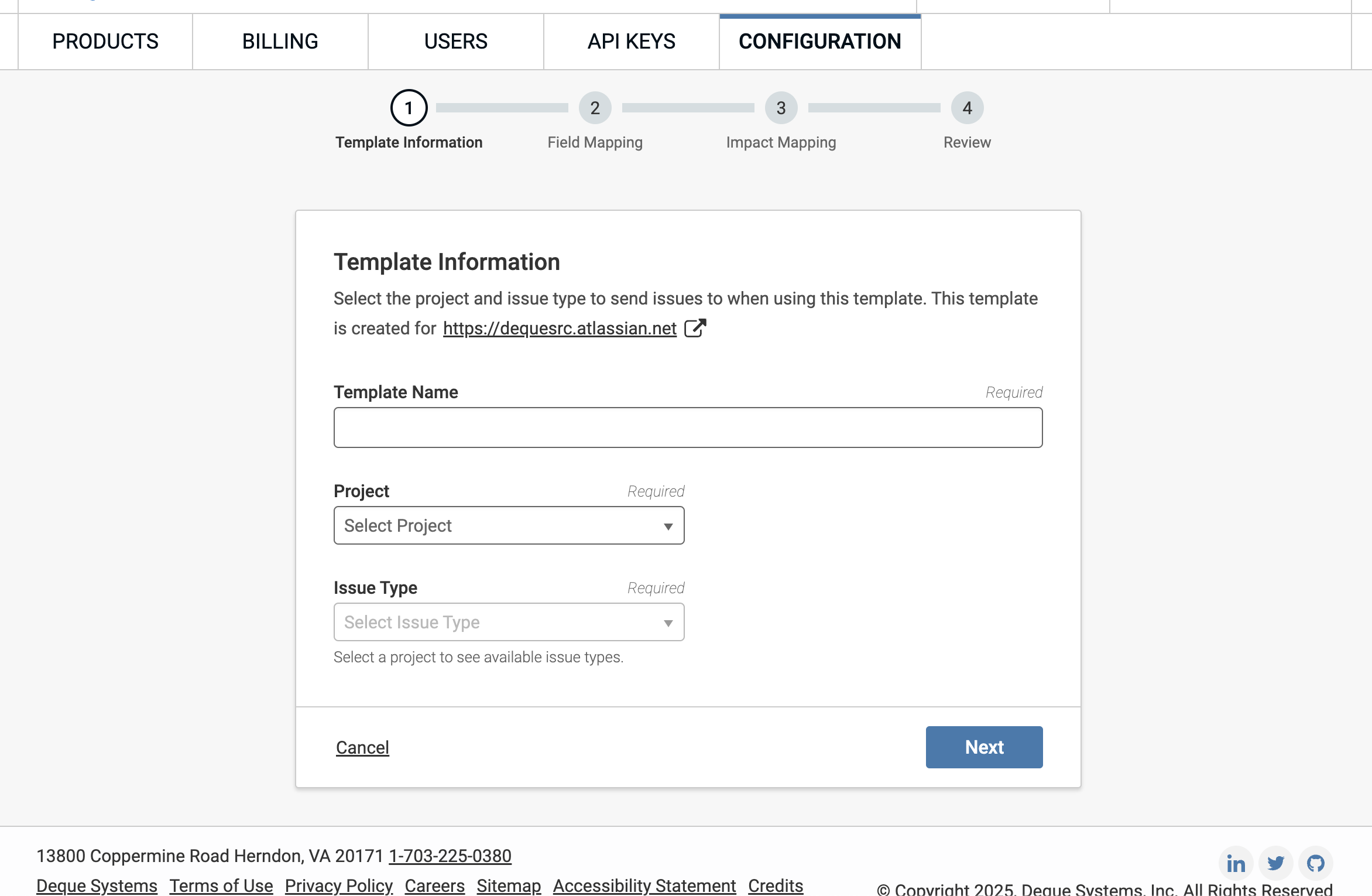 The first step in creating a template is to configure the basic information that determines where and how issues will be created in Jira.