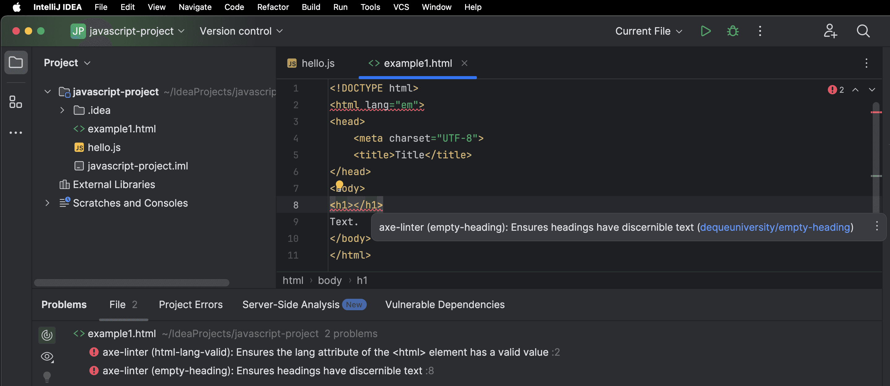 Similarly, for IntelliJ, the following screenshot shows two accessibility errors (a misspelled value for the lang attribute and an empty heading element):