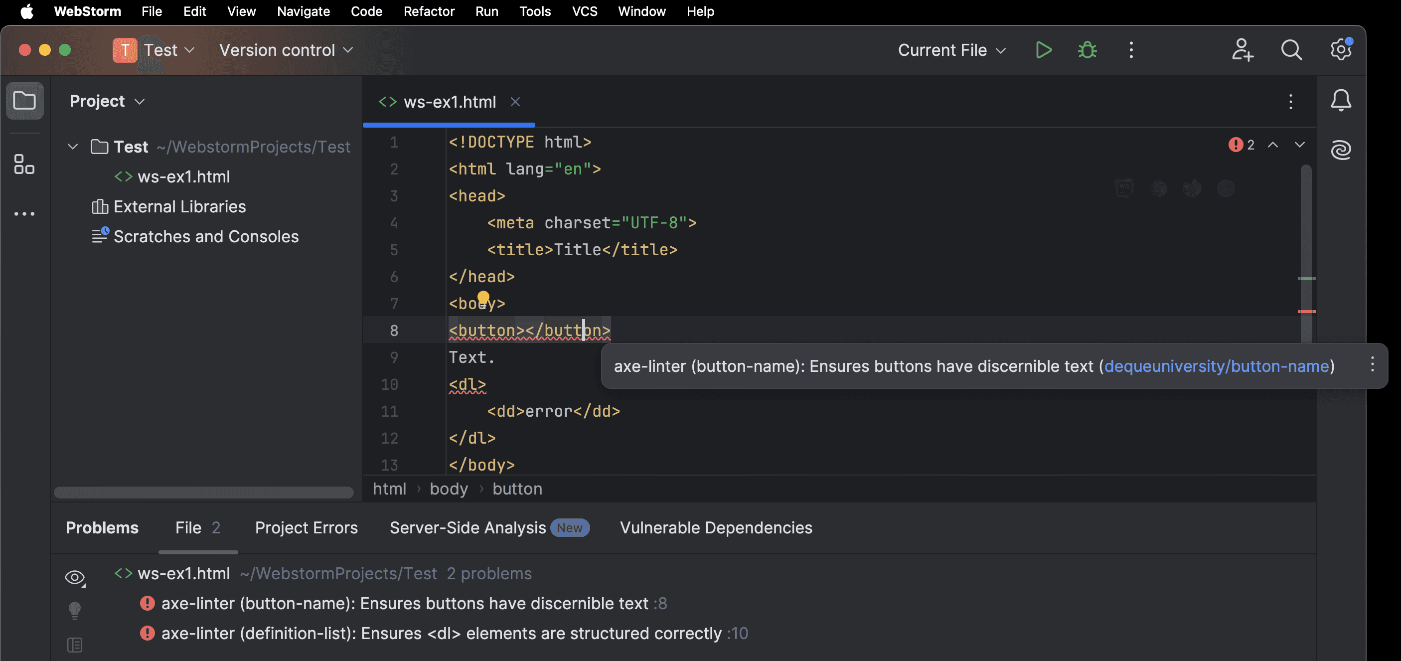The plugin highlights accessibility errors in the IDE with a red wavy line and provides a tooltip indicating the error. The tooltip includes a link to Deque University for more information about the specified accessibility error. The accessibility errors also appear in the Problems tool window in the IDE, as shown below in WebStorm: