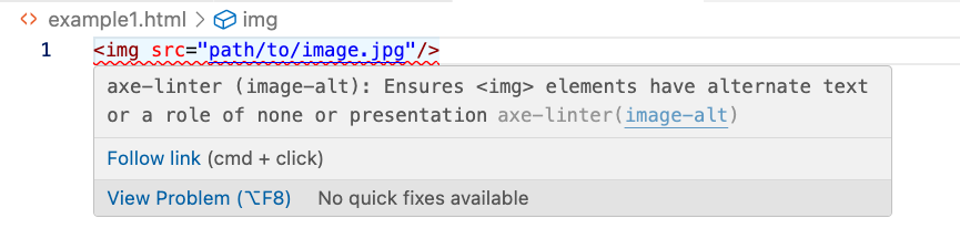 The extension highlights the line in error and provides a tooltip when you hover your mouse cursor over the error. Because this img element doesn't have an alt attribute, you'll get an accessibility error from the extension in your IDE (VS Code is shown):