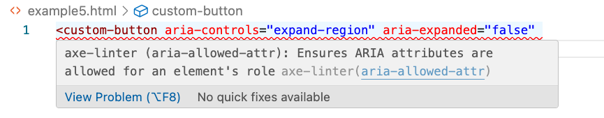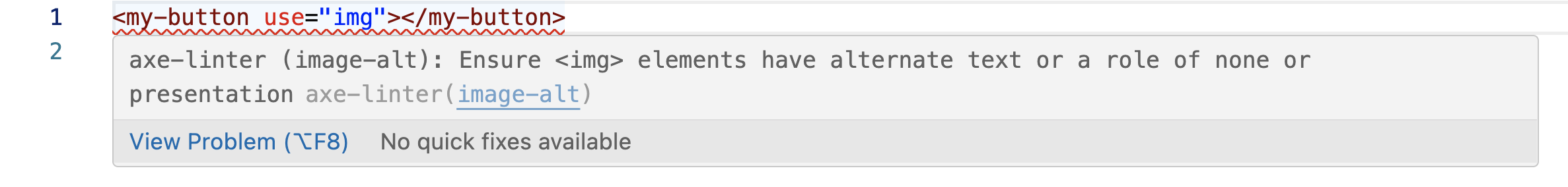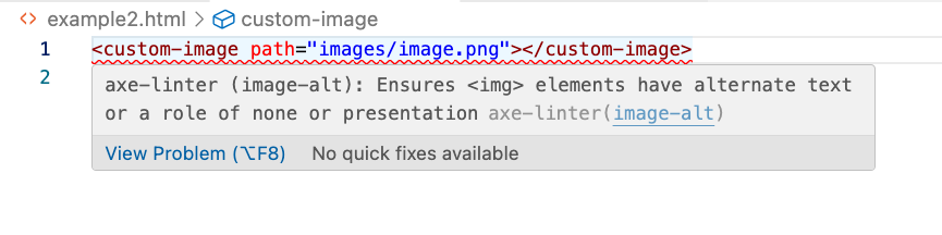 <custom-image path="images/image.jpg"></custom-image>For this example, the custom-image component creates an img element with a path attribute (which is mapped to a src attribute by the custom control's implementation). The extension shows no error because the extension has no mapping between custom-image and img even though the output img element is missing an alt attribute: