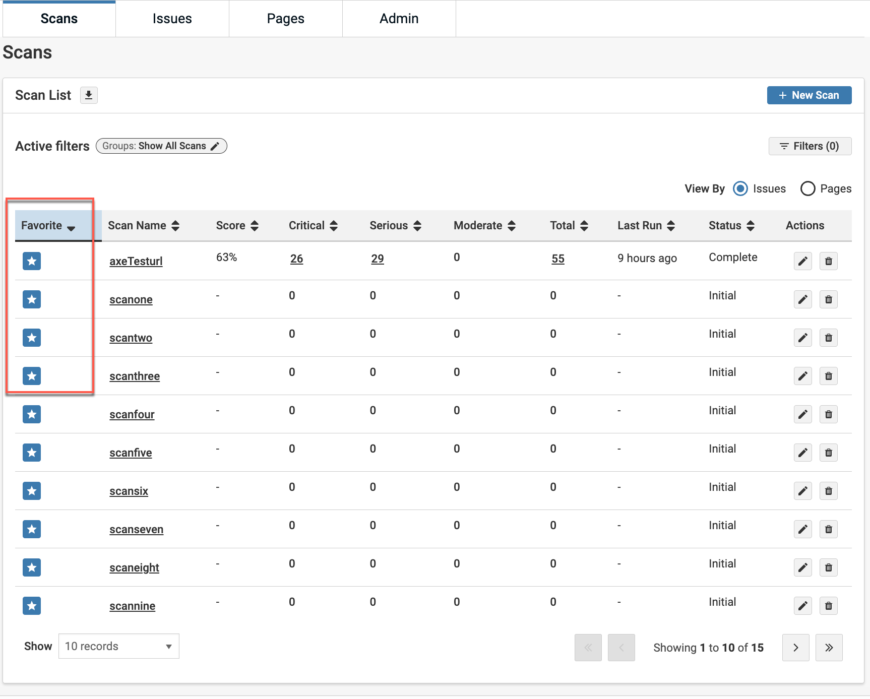Axe Monitor provides the concept of marking scans as a Favorite. Marking a scan as a Favorite helps users manage the scans they are most interested in if they are members of many scans but only work in some of them. The default view of the your Scan page shows only Favorite Scans instead of the entire list.
