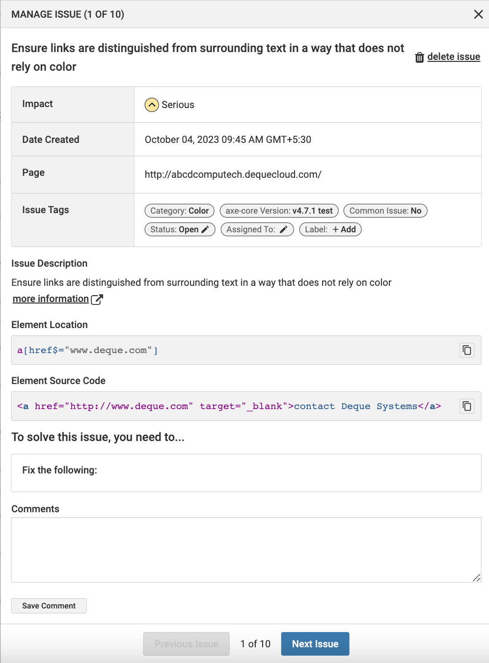 | Element Source Code | A snippet of source code for HTML issues. Use the copy button to copy the element source code. |