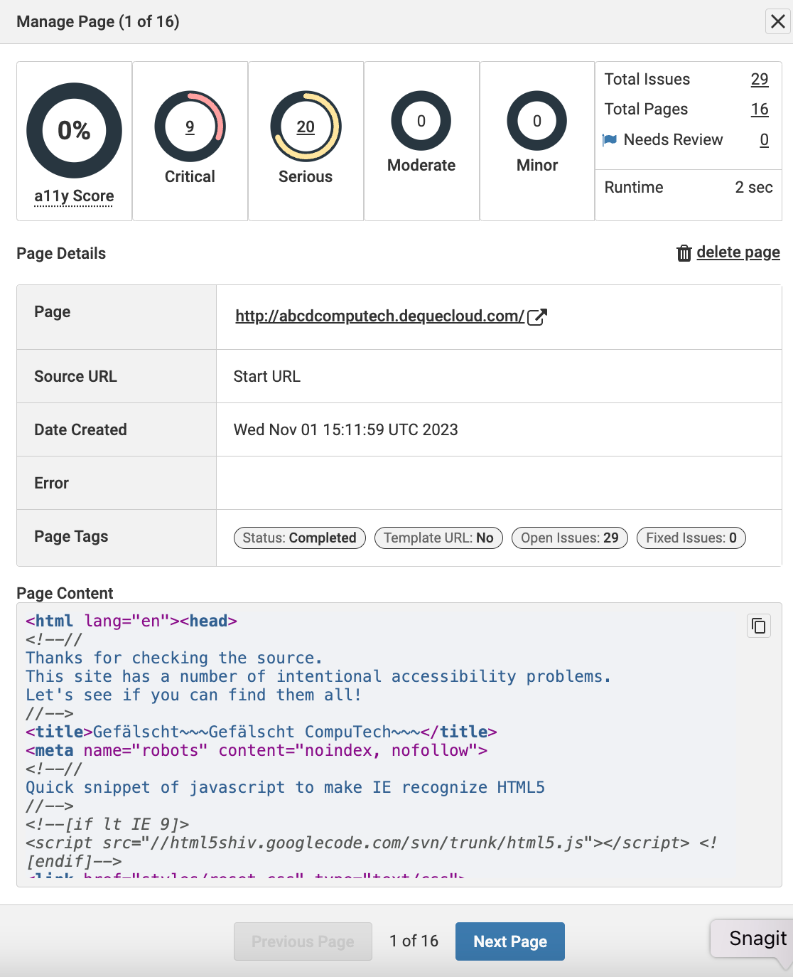 | Page Content | The page's source code is only saved if the scan setting to save page content is turned on. Use the copy button to copy the element source code. |