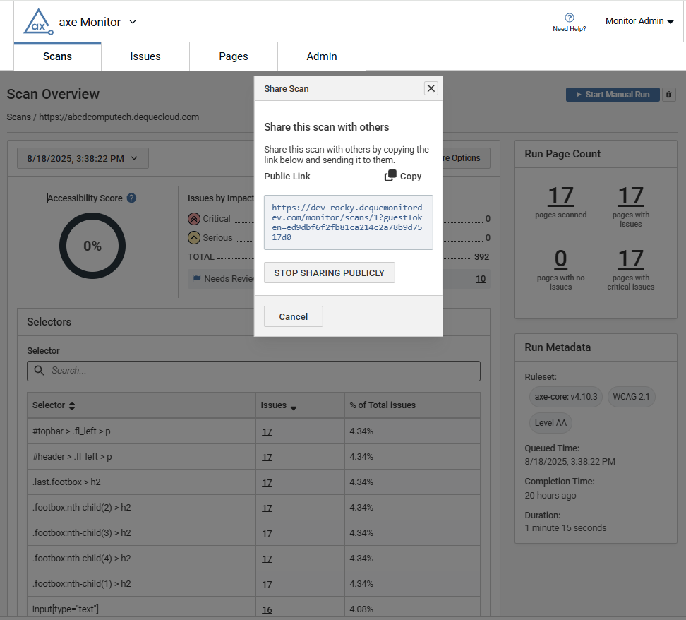 Note for users on version 7.5: Because the URL path has changed with axe Monitor 8.0, you will need to distribute new public share links to version 8 scans in your organization.