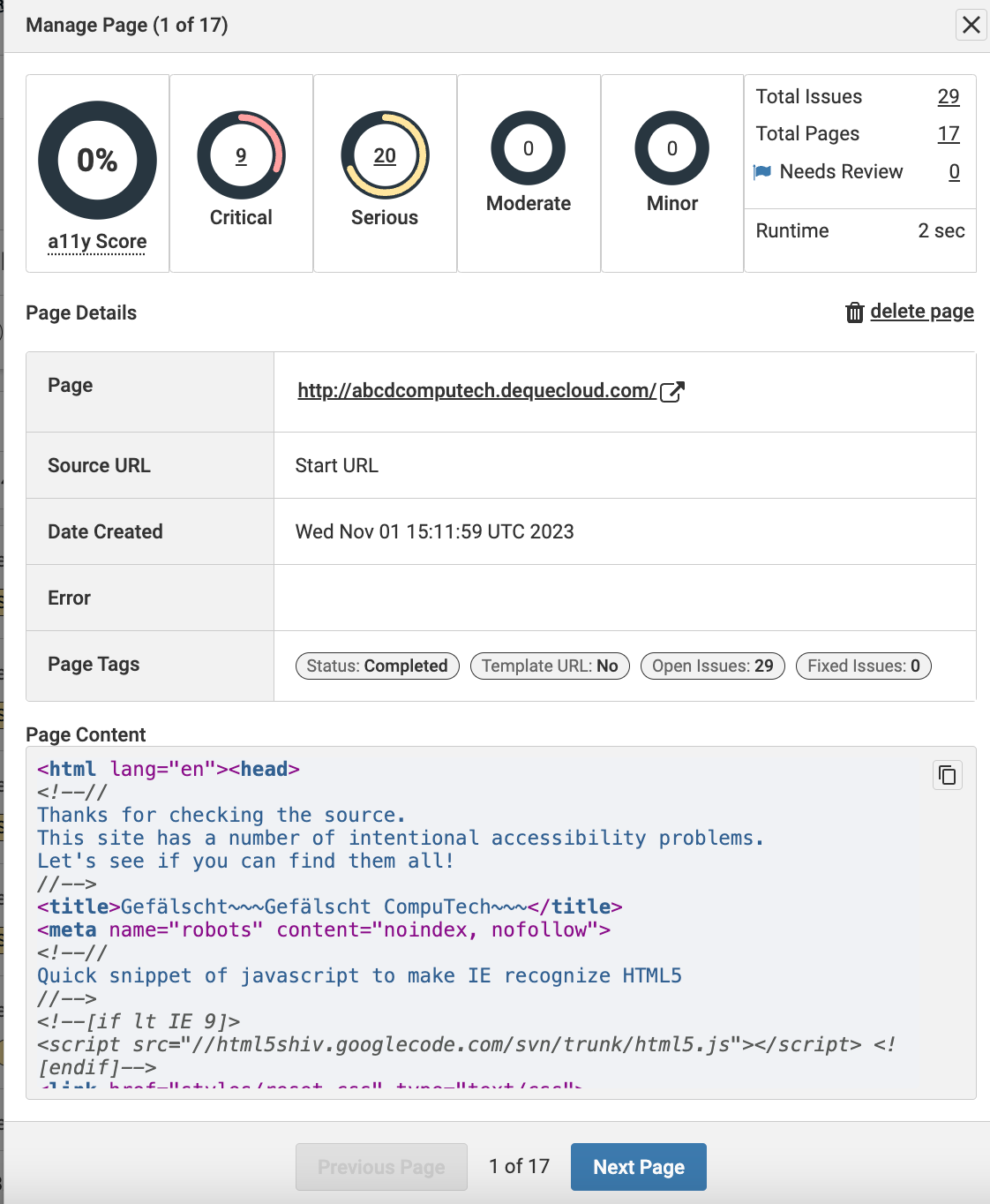 Users can now easily view information about a specific page in a scan on the Pages page. Clicking on the View Page Details icon brings up the Manage Page dialog box, where you can find information such as the accessibility score, a number of critical, serious, moderate, and minor issues on the page impact, total issues within the page, total number of pages in the scan, runtime in seconds, link to the page, source URL, date the page was created, and so on.