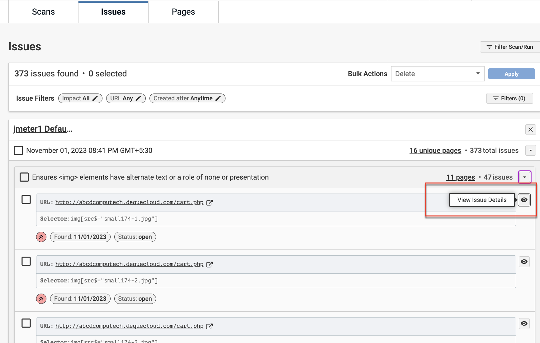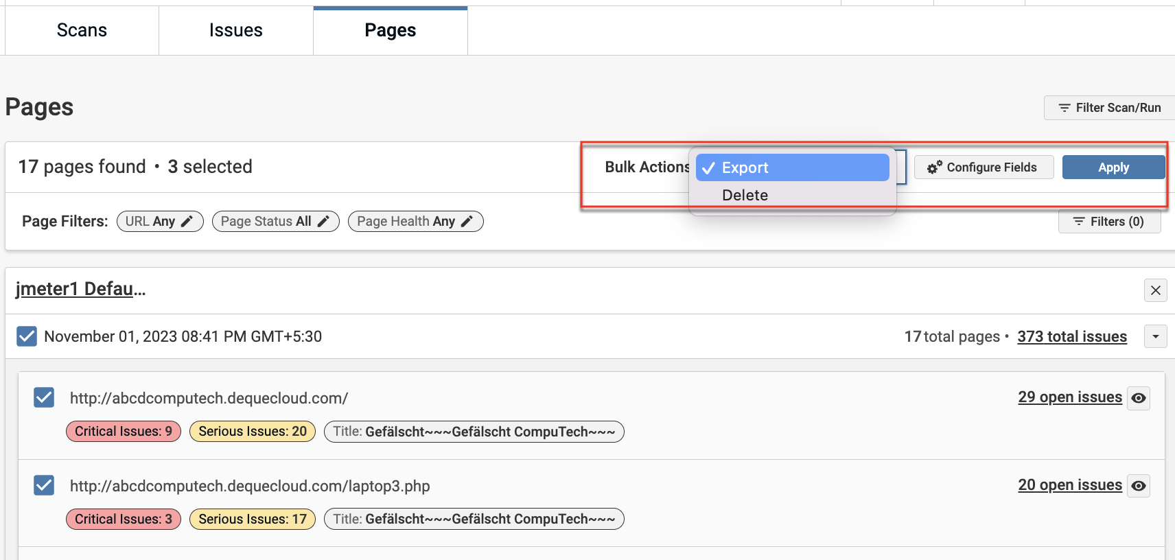 - In the Experimental view, when performing bulk actions like Export on Issues or Pages, filtered selections from a previous scan were mistakenly included, even if the new scan's selections were different in the Scan Filter modal.