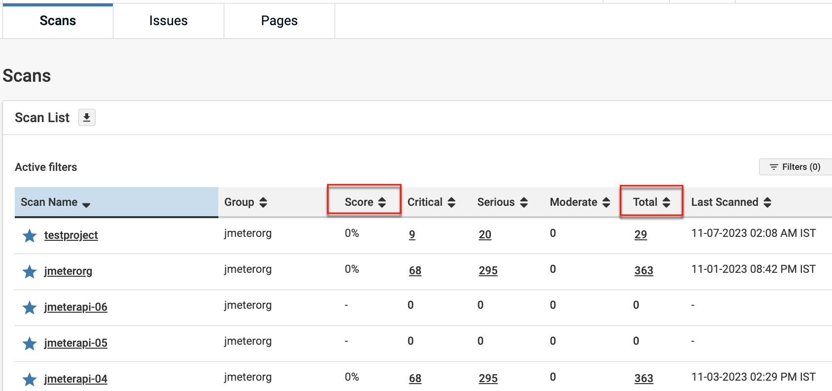 The Accessibility Score column on the Scans List page has been renamed to Score. The page also has a new column, Total, added to the list, displaying the total number of issues for a scan.