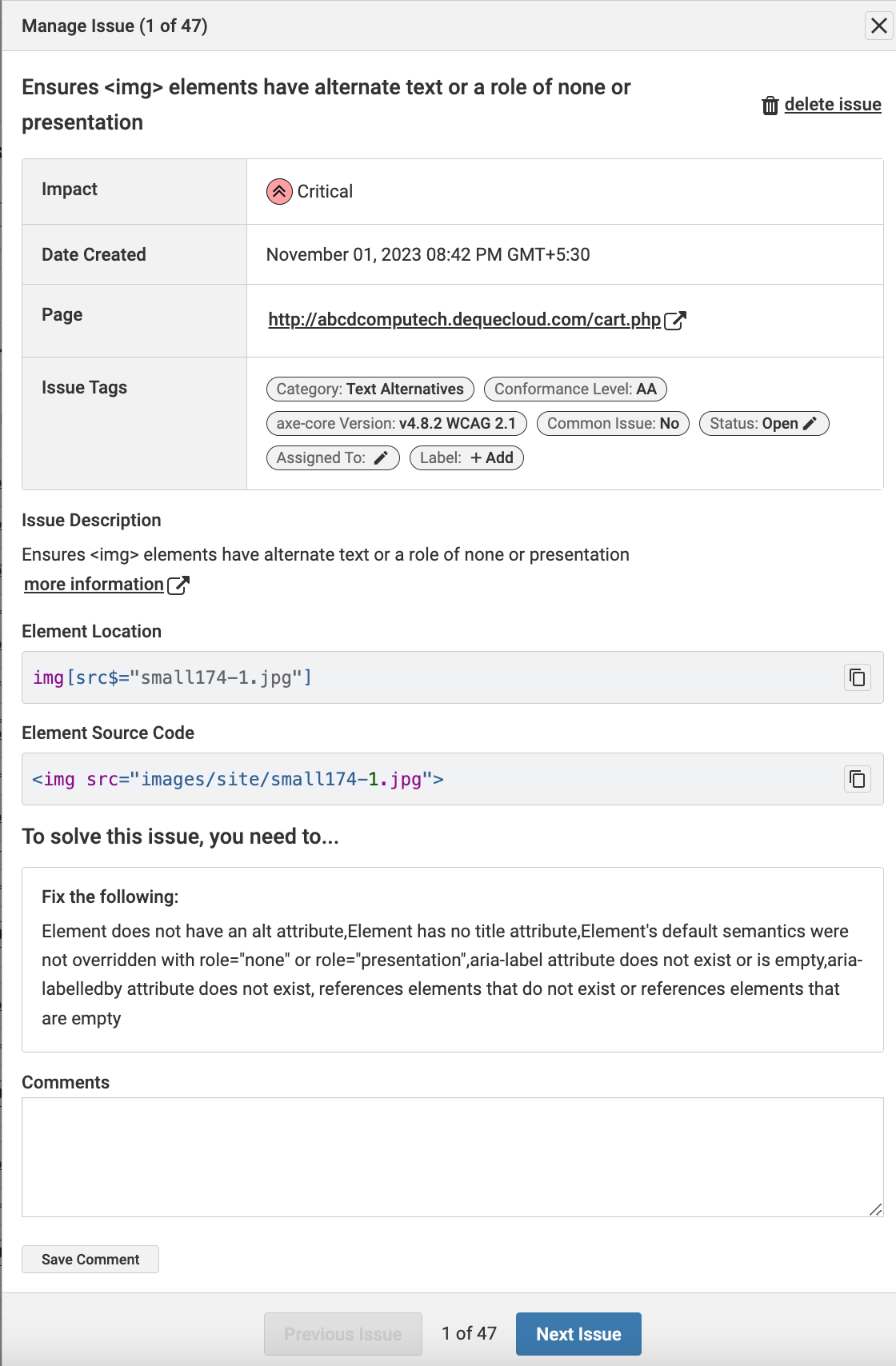 Users can now easily view information about a specific issue in a scan on the Issues page. Clicking on the View Issue Details icon brings up the Manage Issue dialog box, where you can find information such as the issue impact, the date the issue was created, the issue description, element location, element description, comments, etc.
