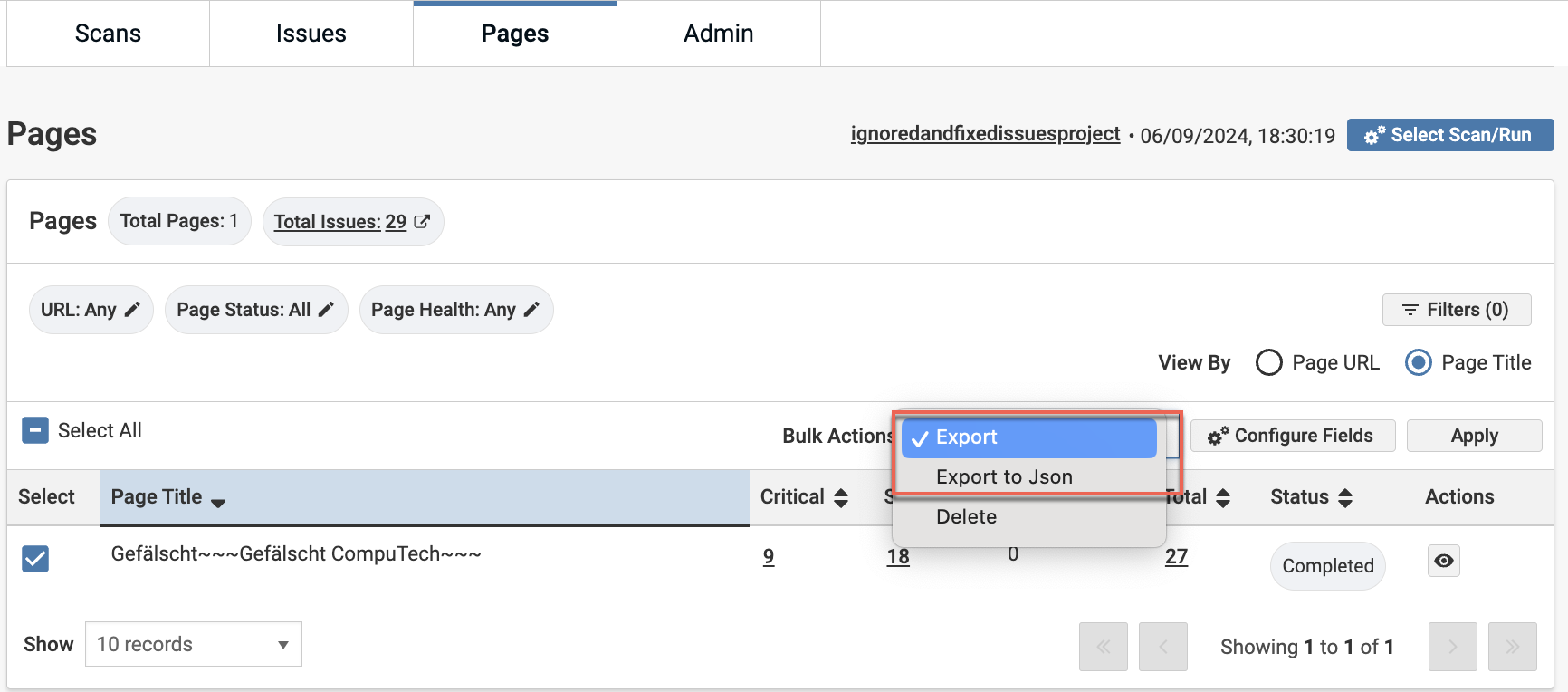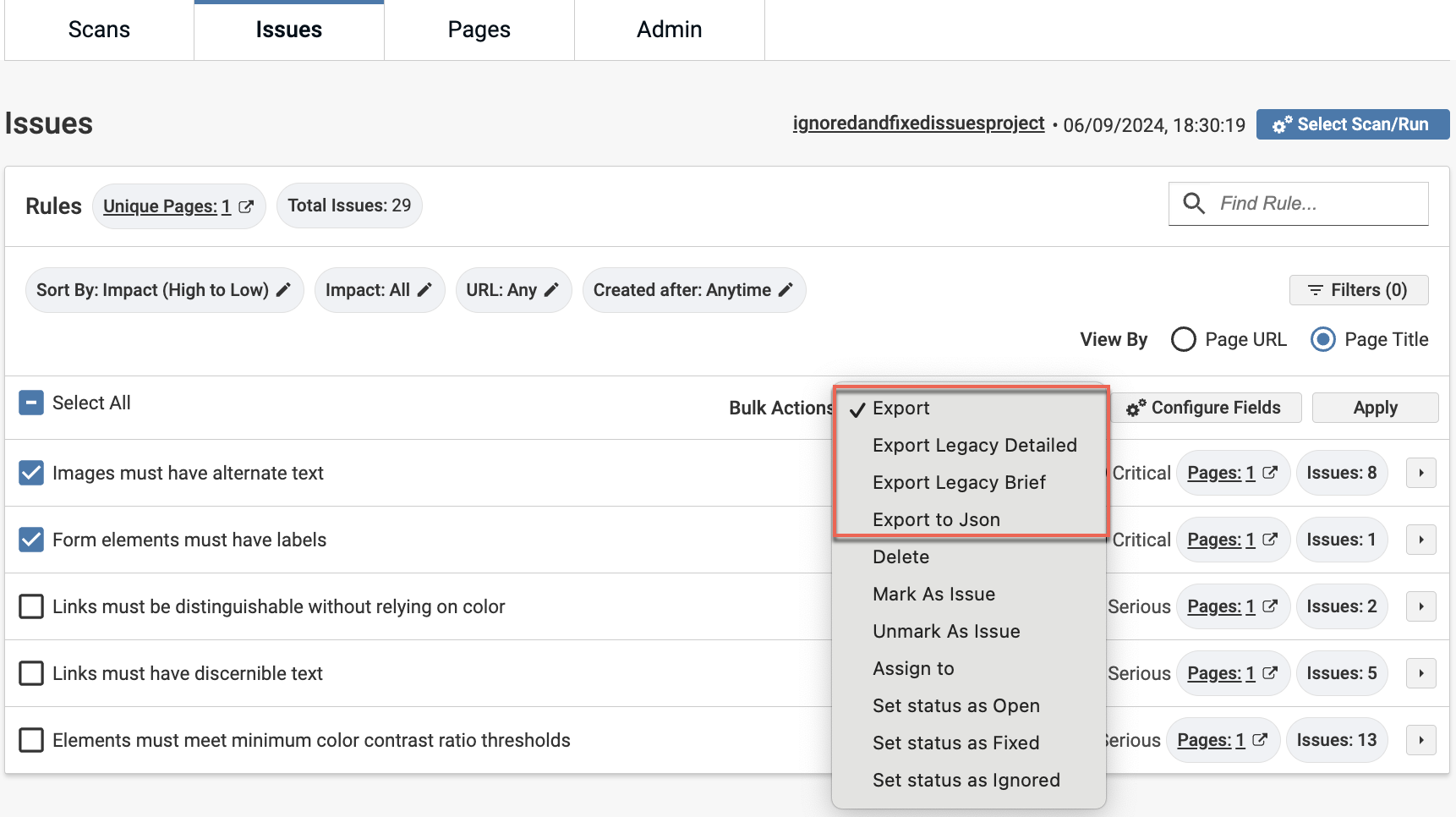 Users can generate reports in CSV and axe Universal JSON with configurable fields tailored to their specific needs. Additionally, they can drill down into issue details and page content directly within the reports for deeper insights.