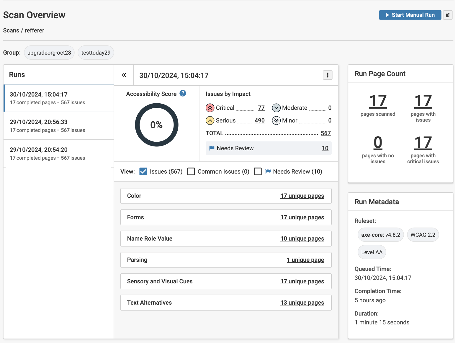 Get a comprehensive view of the Scan data on a single page, providing insights for efficiently managing accessibility testing, data visualization, and issue analysis.