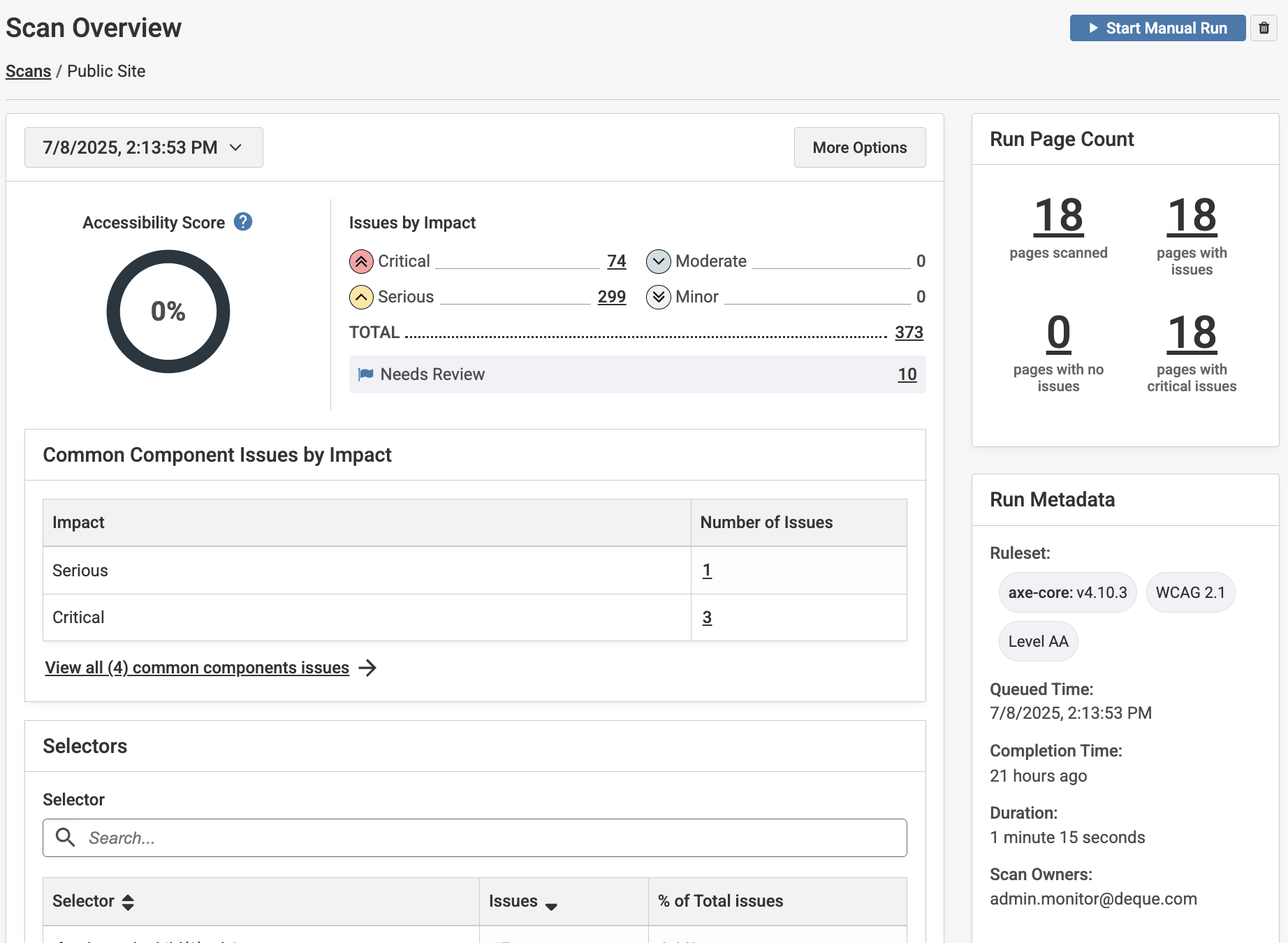 Selectors are used in your site’s codebase to structure and format the website. Selectors often appear across several pages. Fixing an accessibility issue on one selector, or in one area of your code, is often more impactful to reducing your overall issues. For example, fixing an accessibility issue on an “img” selector may fix 20% of all the accessibility issues in your results.