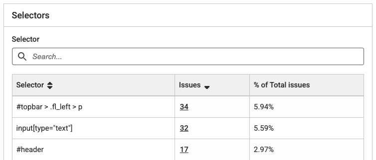 The table shows the selector, number of issues and a link to a filtered issue list, and the % of total issues from this selector. The most important selectors to fix first show at the top of the table. By default, the table is sorted by selectors responsible for the highest % of accessibility issues.