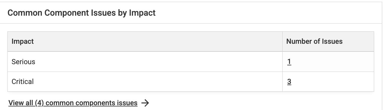 If the scan settings have Common Components applied and accessibility issues are found, the “Common Component Issues by Impact” table allows you to understand which common component fixes should be prioritized first. Select a count in the table for a filtered list of critical, serious, moderate, or minor issues related to common components.