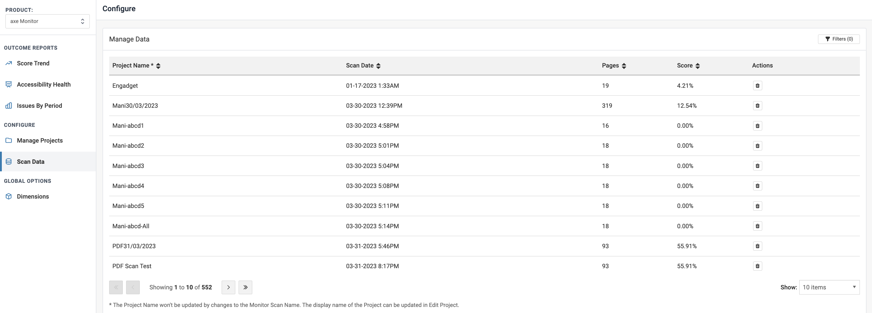 Navigate to the Configure section and select Scan Data. Ensure that the product selected is axe Monitor. You will find a list of scans for a specific project.