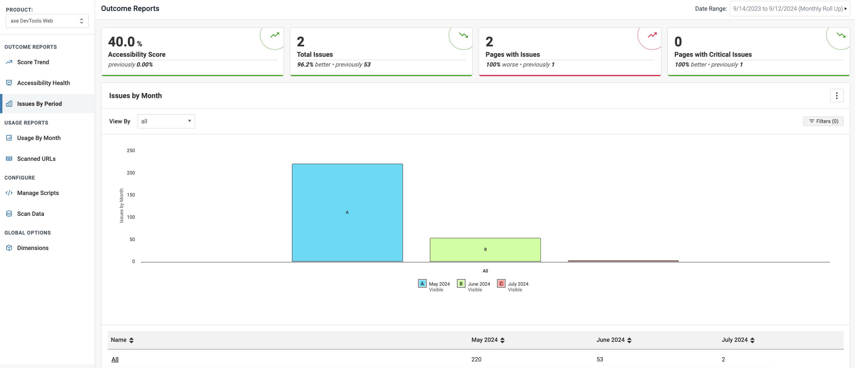 This chart captures how your issues are trending with the total number of accessibility issues rolling up to the period you've selected. The default period is Issues by Month, and the chart represents each month in your selected start and end dates if data exists for that period. If you selected 'Week' or 'Day' in the roll up selection, the chart filters the data to reflect your selection and renames the chart accordingly.
