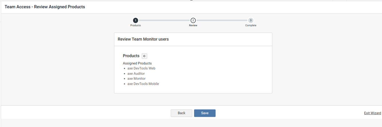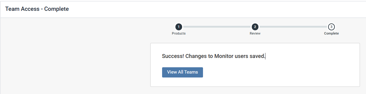 - Review the assigned products and click Save. The Team Access – Complete page is displayed.