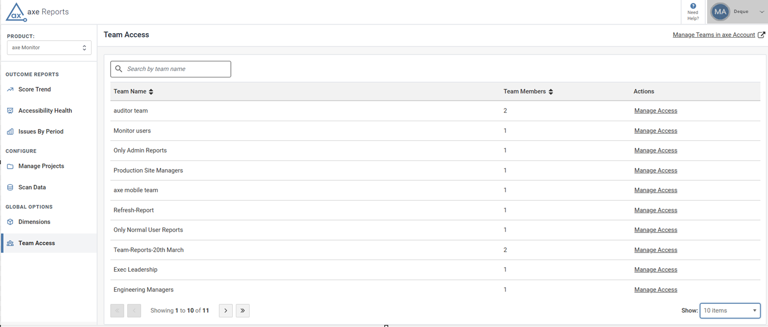 If you’re both an axe Account admin and an axe Reports Admin, and your organization purchased more than one Deque product with axe Reports, you can limit teams’ access to certain Deque products.