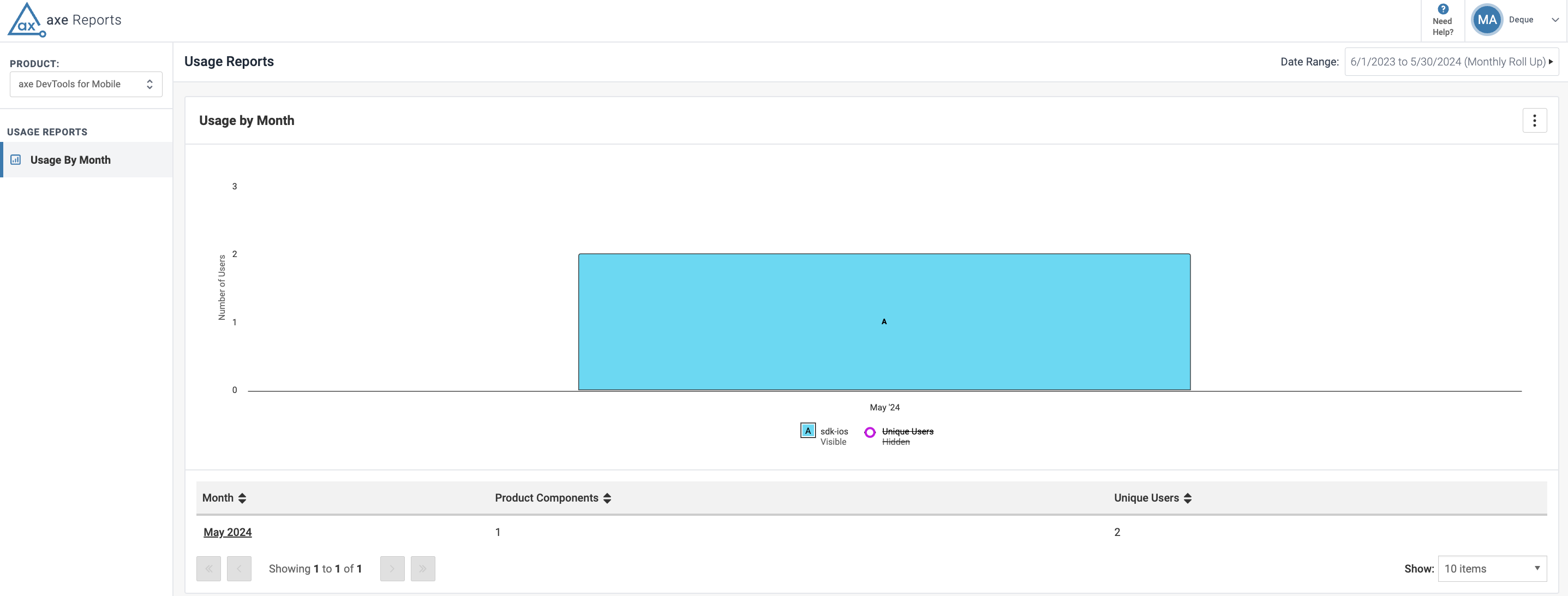 Select axe DevTools for Mobile from the Product dowpdown, and select a date range to show unique users & product components tested.