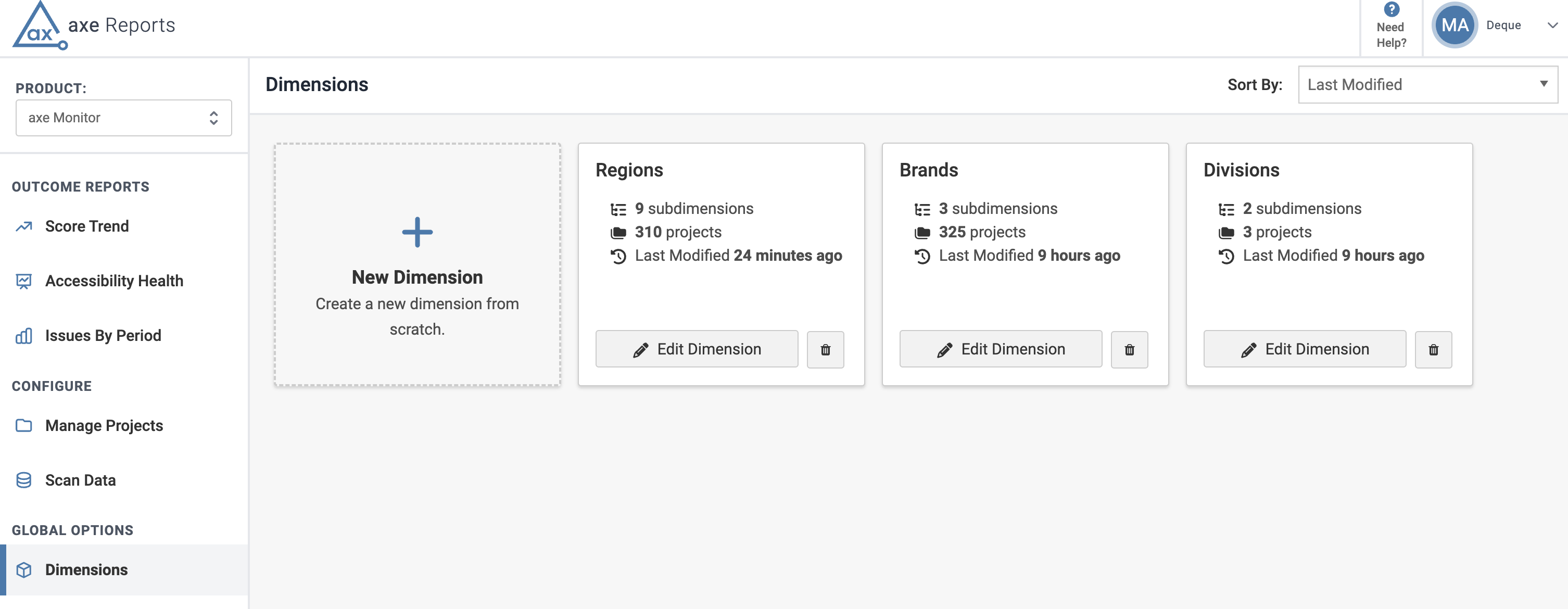 Axe Reports admins can now add axe Monitor Scans, axe Auditor Test Cases, and axe DevTools for Web Scripts to a single Dimension. Add or edit Dimensions from the Global Options menu. Assigned Scans or Test Cases are displayed based on the selected product.