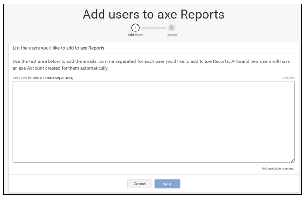Axe Account admins can now add users to axe Reports directly from axe Account, instead of contacting Helpdesk.