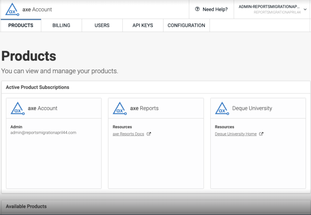 From the homepage of axe Account, you can now navigate directly to axe Reports or visit documentation.