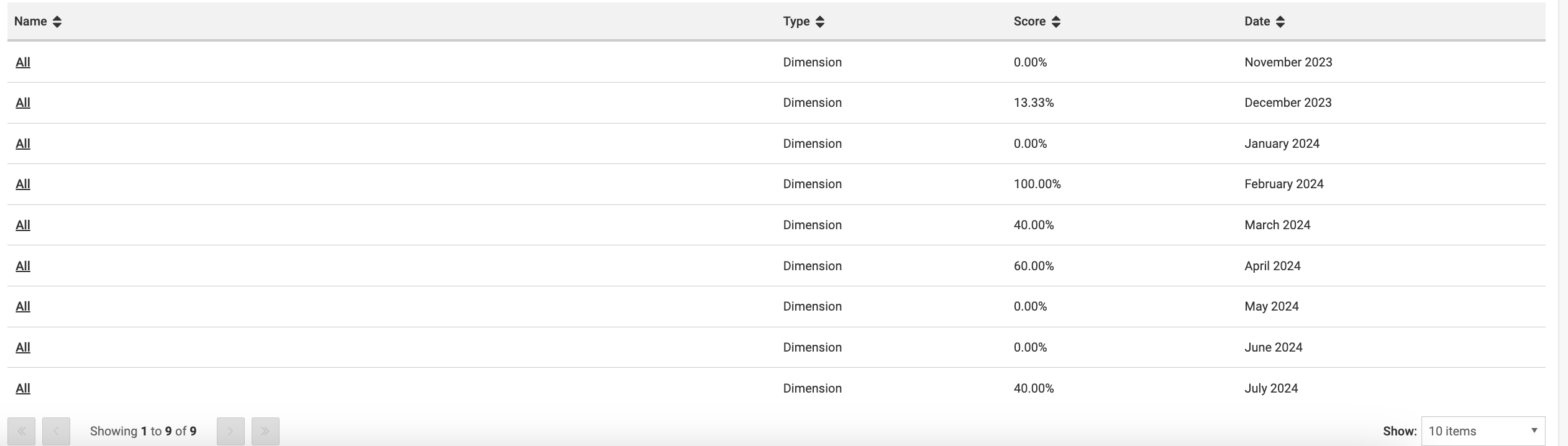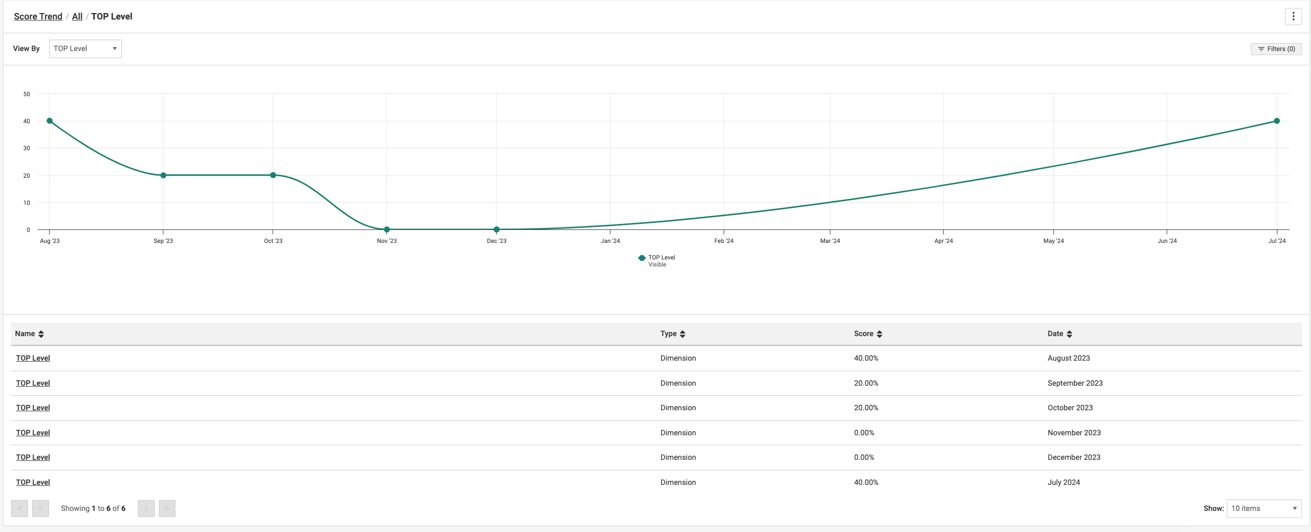 In the Data Table view, the Accessibility Score Chart displays the data in a Data table with Scores for each level, for each date a scan was completed in the selected date range. Clicking the score drills down into lower levels.